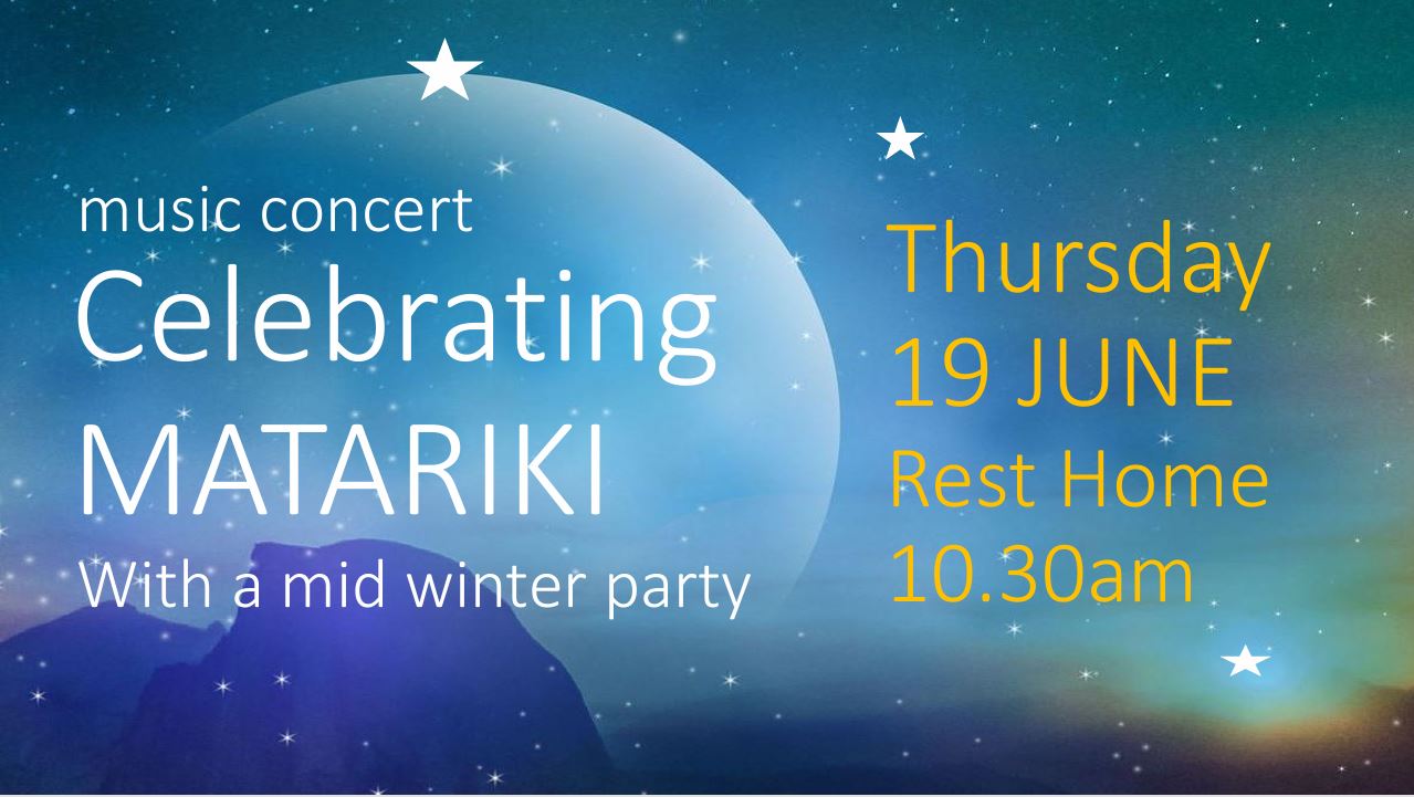 Kia ora koutou – on Thursday 19th June from 10:30 until 12:30 we are hosting our annual Matariki celebration in the Rest Home Lounge at Te Hopai with residents, their friends and families.